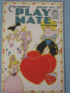 Children’s Play Mate Magazine, February 1951 cover by Fern Bisel Peet, Valentines issue,b & w, includes color valentine by Angela Price, 53 pages, very good condition, some wear on lower spine, $11