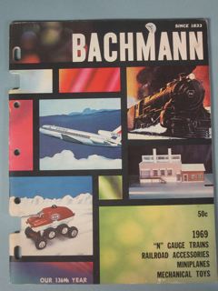 Bachmann Train Catalog 1969 includes “N” Gauge Trains, railroad accessories, miniplanes,and mechanical toys, 35 pages all in color. Excellent condition. $25