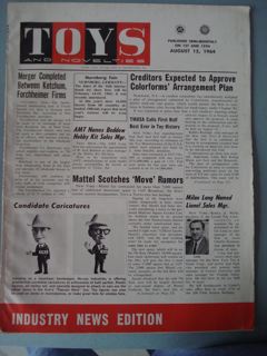 Toys & Novelties, Industry News Edition, August 15, 1964 has photo of Barry Goldwater and LBJ dolls on cover and Beatle bobble-heads inside. $20