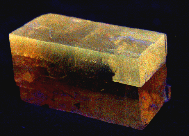 This cleaved Calcite rhomb illustrates zoned fluorescence, which follows a cleavage plane.