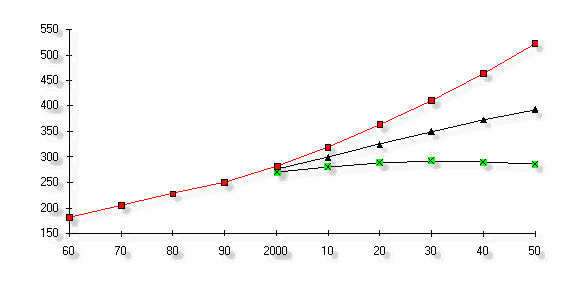 Since at present annual immigration is 1.2 to 1.5 million a year and the fertility rate is 2.1 and increasing due to the large immigrant families, the present estimate for the year 2050 would fall somewhere between the middle and high series, i.e., perhaps about 450 million, an increase of 184 million persons in only about 50 years. But note that the trend is increasing at an increasing rate. Hence, by 2050 we would be adding over 40 million persons a decade.