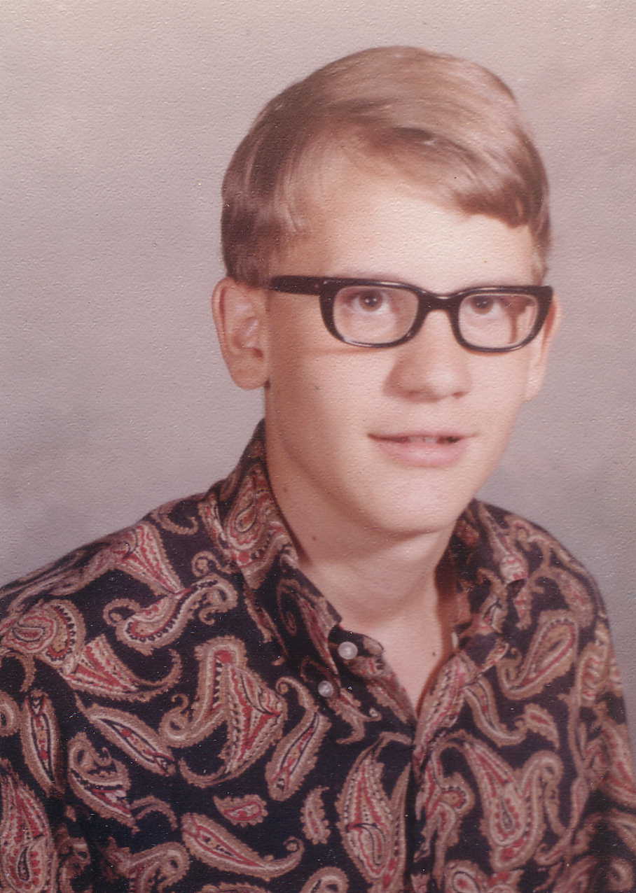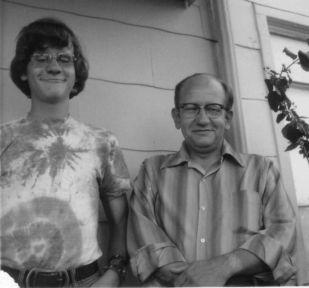 1969, I was in 8th grade. This was in the summer. I was a bit of a "freak", complete with the tie died shirt. Dad is next to me. This was just before he really starte to losen up and look at the whole world a bit differently. I think he even voted for Nixon. He was a very good accountant for a utility company, and we often spend hours talking about everything from his job to Vietnam and Religeon. I got really good at looking stoned, even when I wasn't. | |