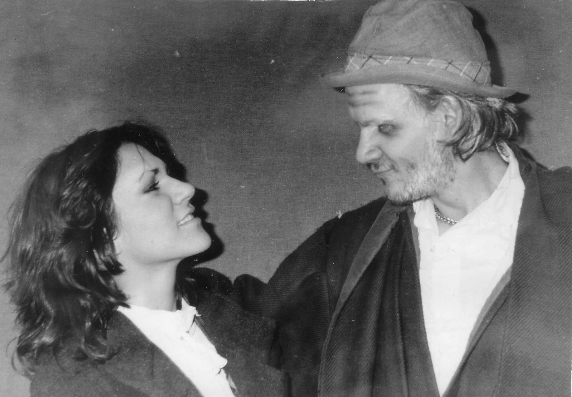 This is a still from our performance of the Cave Dwellers. I played an old retired actor, who lived in the back of a theater with an old actress. connie plays a young girl who is lost and wants to get out of the cold. | |