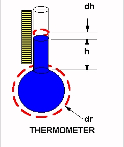 Thermometer Paradox If the fluid in the thermometer bulb were unconstrained and free in space, its spherical volumetric change would be the derivative of the spherical volume with respect to the spherical radius. This derivative is equal to the surface of the sphere, wherein the spherical radius is squared. The fluid in the stem undergoes its volumetric change as a cylinder of constant cross section; and, the only variable is the linear height. The temperature graduated units on the thermometer stem are equal and linear. The actual expansion of the fluid is a parabolic function, while the actual representation at the scale on the thermometer stem is a straight line. No wonder so many different temperature scales and components thereof are necessary in the sciences of physics, chemistry, heat transfer, and thermodynamics. |