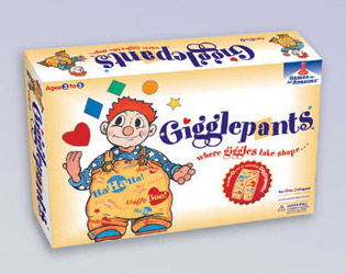 Logo, package, board, and pant design for Gigglepants, a toddlers game during which players are rewarded by getting to put on a pair of wearable Gigglepants over their clothes. Designed for Games for All Reasons, LLC.