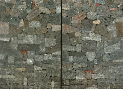 3.3m X 4.2m. Asphalt, fabric, sand, shells, paper, weeds and other materials on canvas, 2001